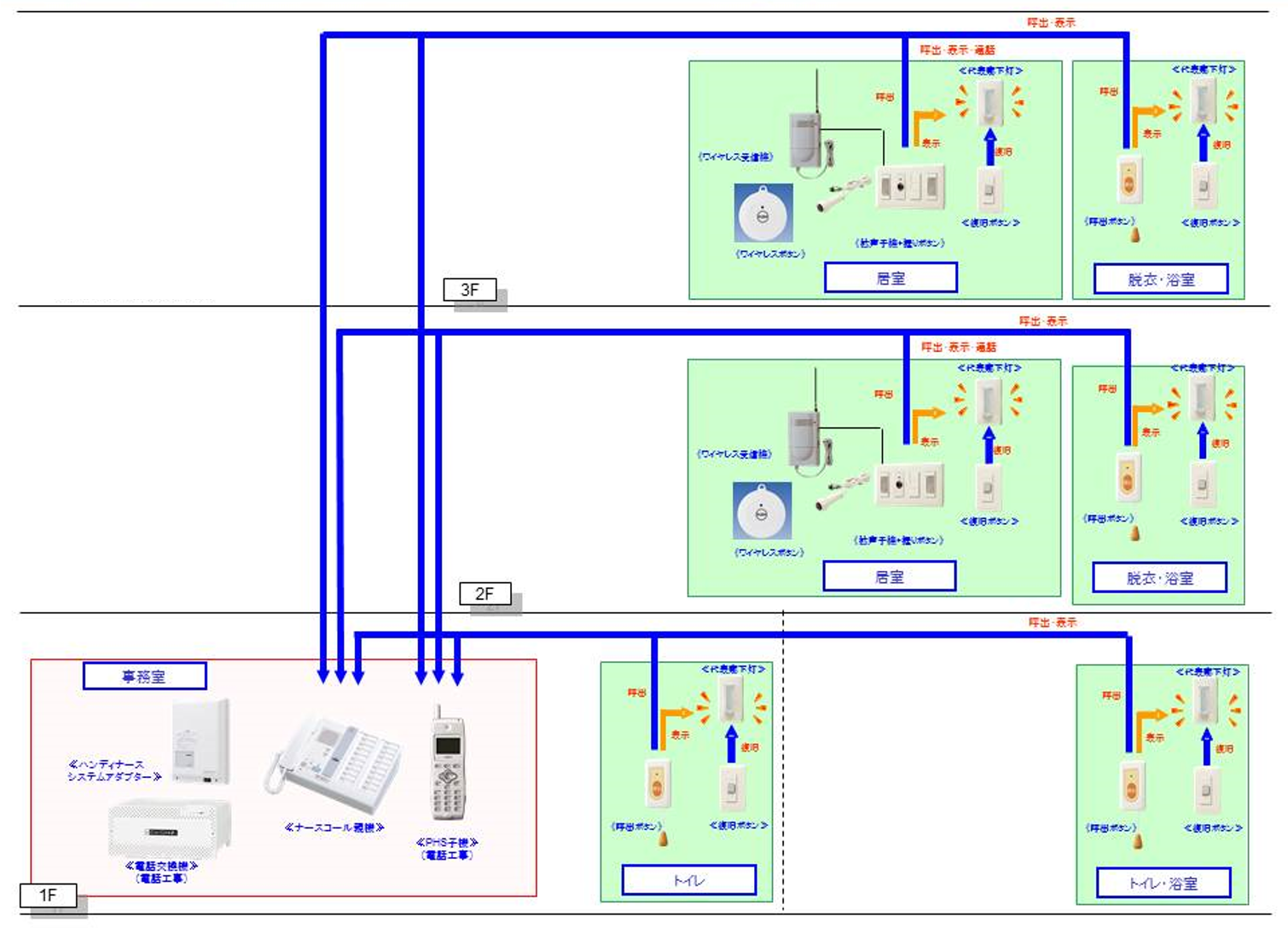 ※トイレ、脱衣・浴室には通話機能はありませんので、呼出のみとなります。